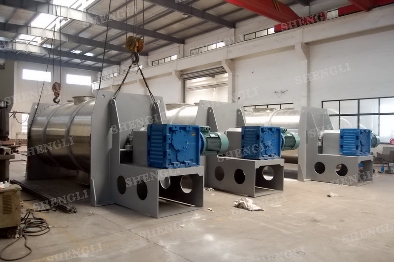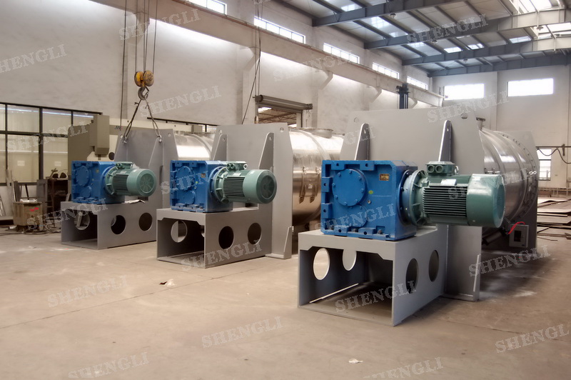 工作原理:犁刀混合機采用臥式圓柱筒體,內(nèi)設(shè)平行主軸,主軸上安裝若干犁式刀頭,通過較快的旋轉(zhuǎn)速度,分割、重合物料,實現(xiàn)快速攪拌的功能,常結(jié)合1500-3000轉(zhuǎn)高速剪切飛刀相互作用。