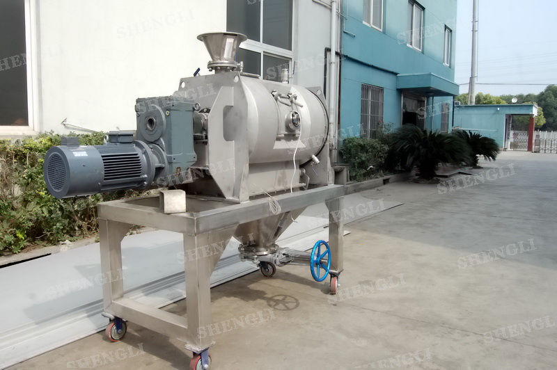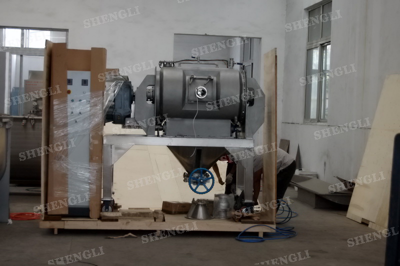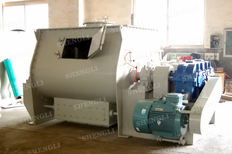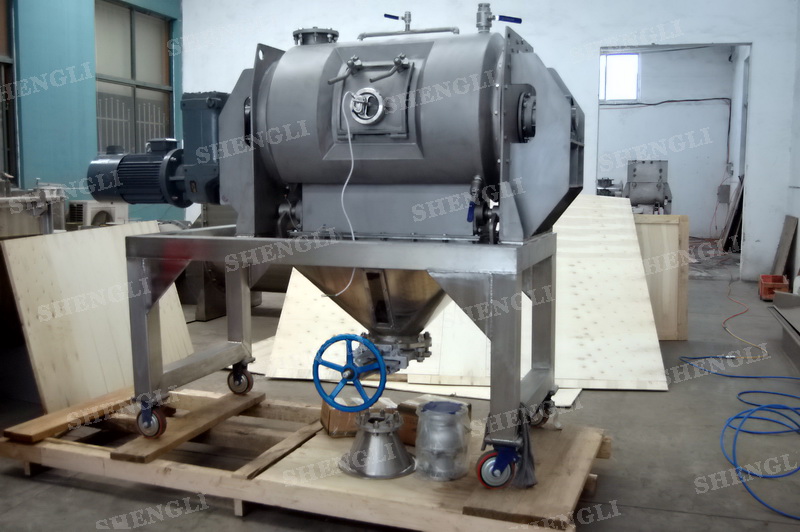工作原理:犁刀式攪拌機(jī)采用臥式圓柱筒體,內(nèi)設(shè)平行主軸,主軸上安裝若干犁式刀頭,通過(guò)較快的旋轉(zhuǎn)速度,分割、重合物料,實(shí)現(xiàn)快速攪拌的功能,常結(jié)合1500-3000轉(zhuǎn)高速剪切飛刀相互作用。