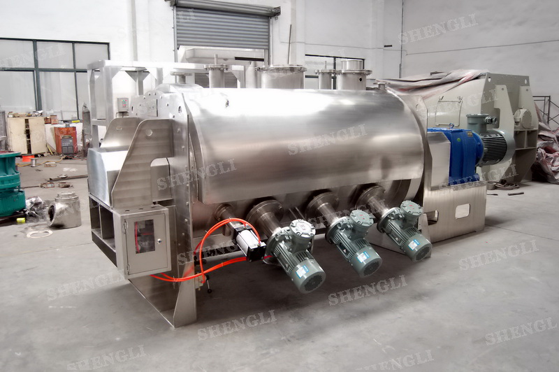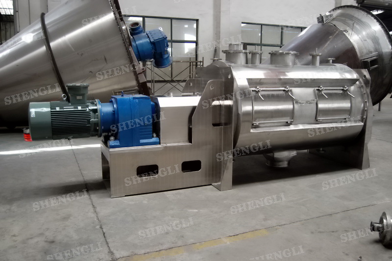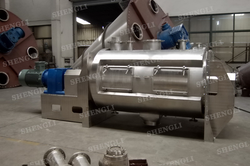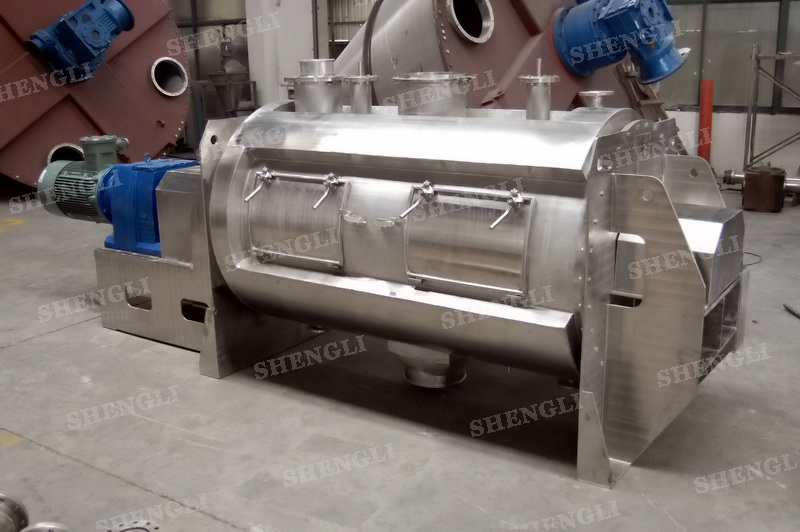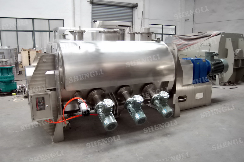 工作原理:犁刀混合機采用臥式圓柱筒體,內(nèi)設(shè)平行主軸,主軸上安裝若干犁式刀頭,通過較快的旋轉(zhuǎn)速度,分割、重合物料,實現(xiàn)快速攪拌的功能,常結(jié)合1500-3000轉(zhuǎn)高速剪切飛刀相互作用。