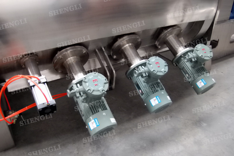 設(shè)備配置:配置R系列減速機,直角安裝;搭載三臺3000轉(zhuǎn)每分鐘的高速飛刀;筒體外設(shè)導(dǎo)熱介質(zhì)夾套;筒側(cè)開設(shè)快開式檢修門附安全開關(guān);出料口采用氣動翻板閥;主軸與飛刀主軸采用氣密封;筒體上設(shè)氣動在線取樣閥;設(shè)備內(nèi)表面鏡面拋光、外表面拉絲亞光。